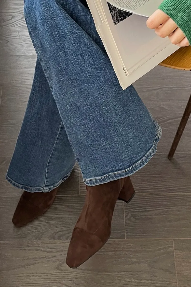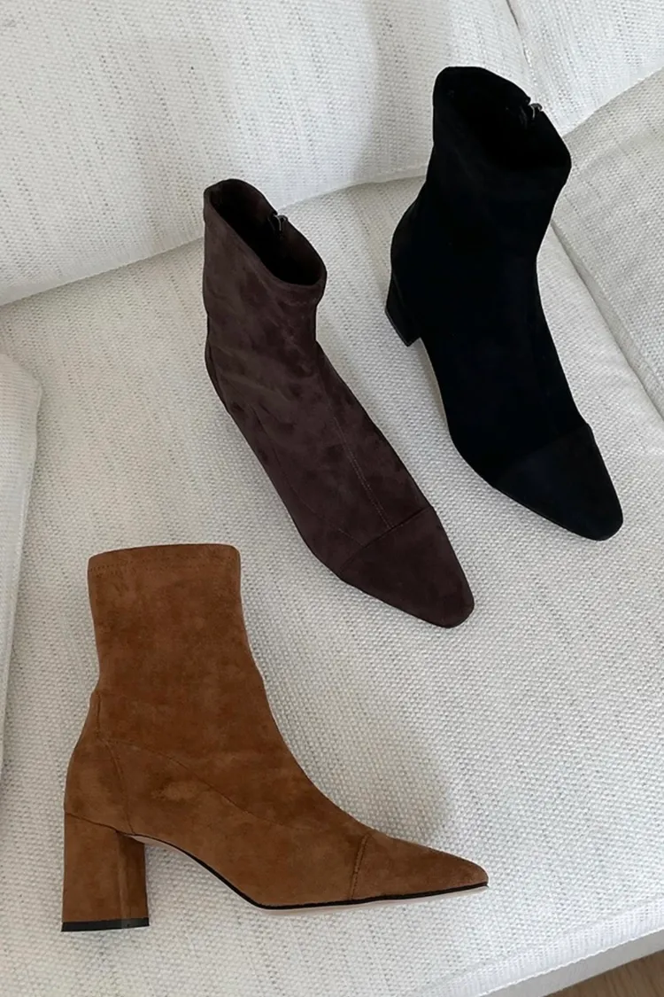 尖頭麂皮粗跟襪靴(三色)