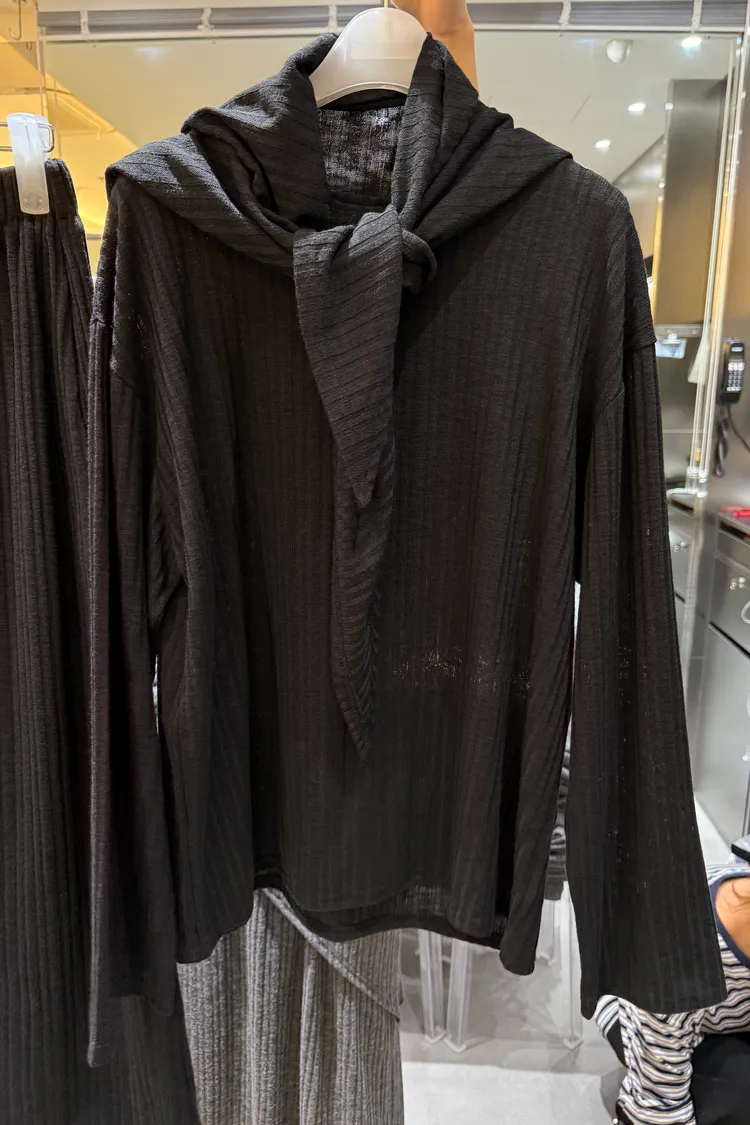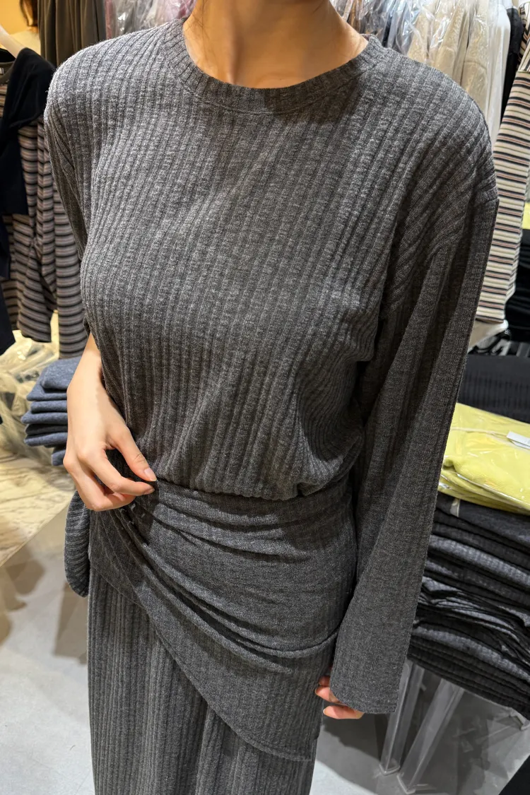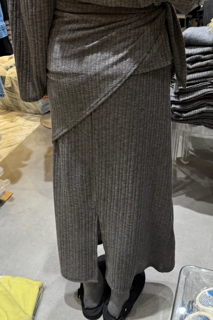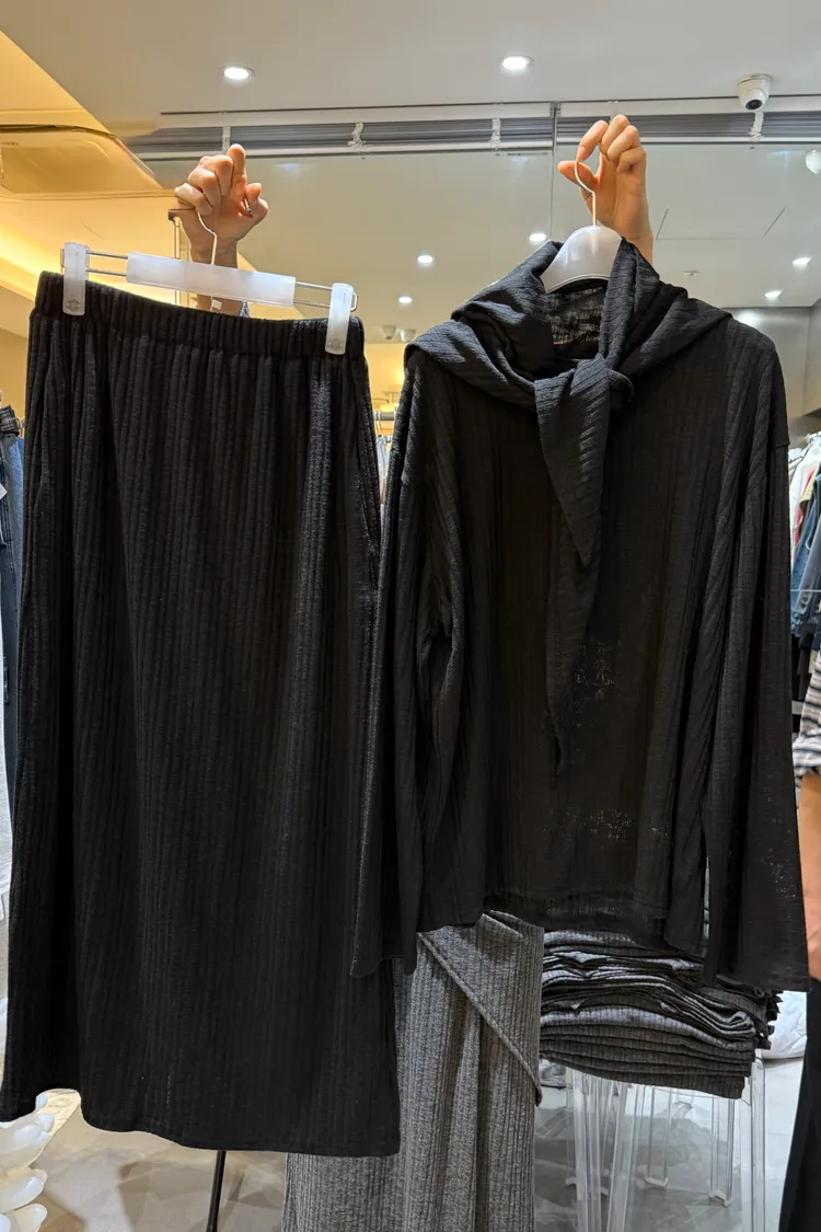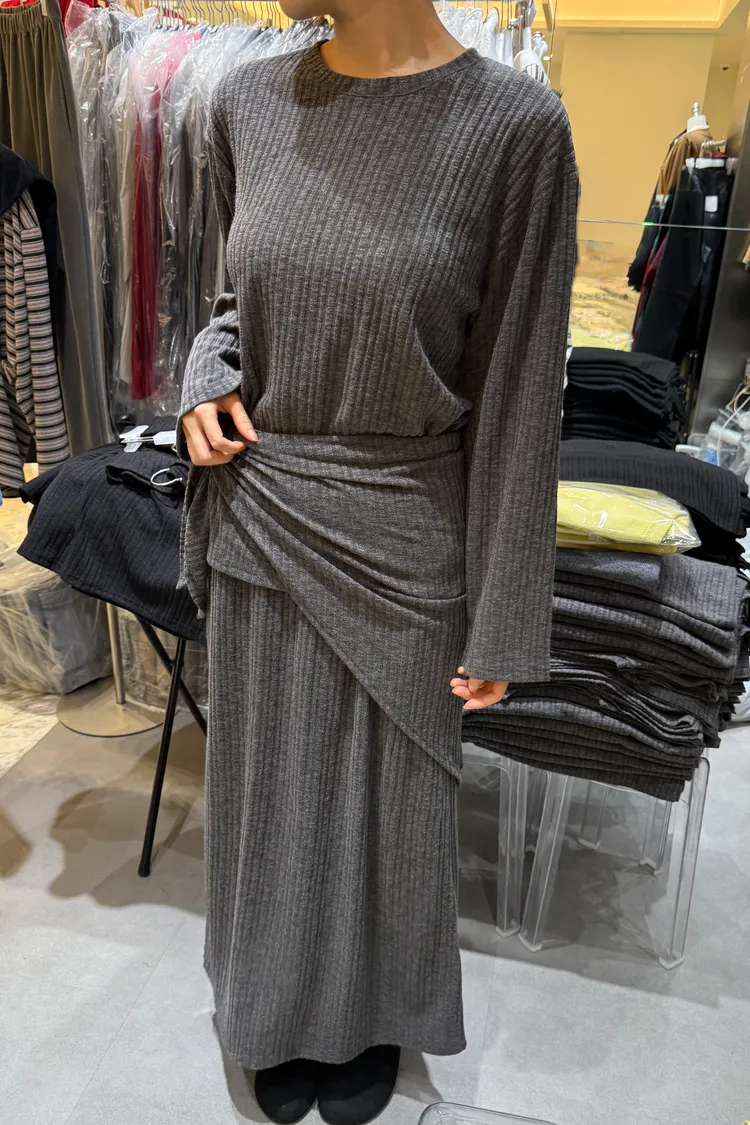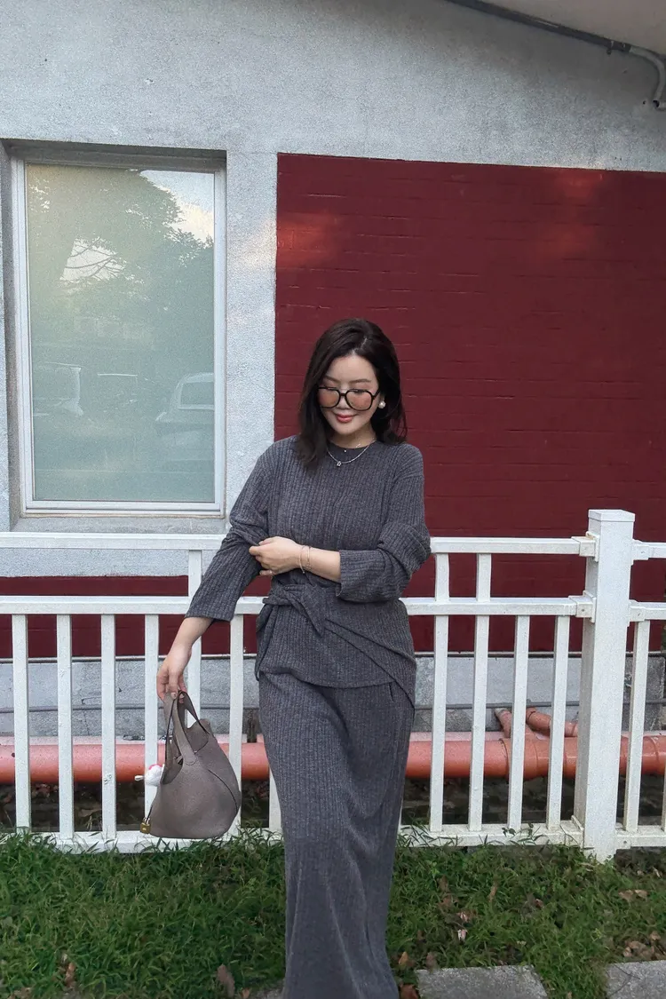 從從容容包辦~坑條長袖Tee+長裙+披肩三件組(二色)
