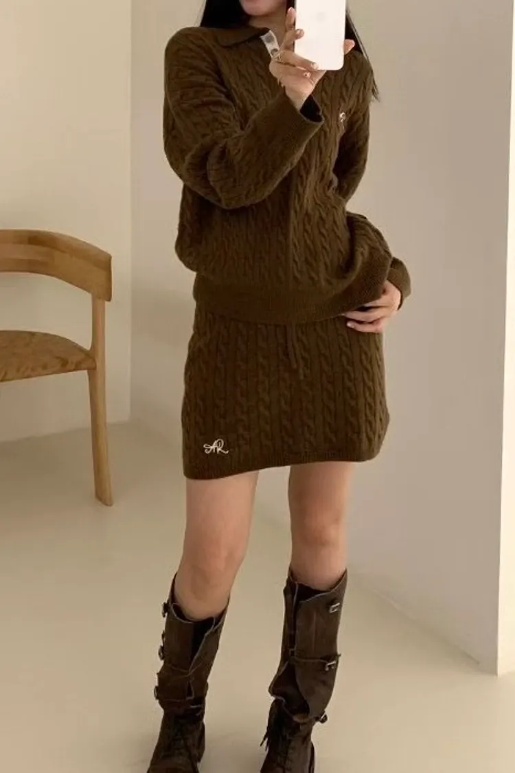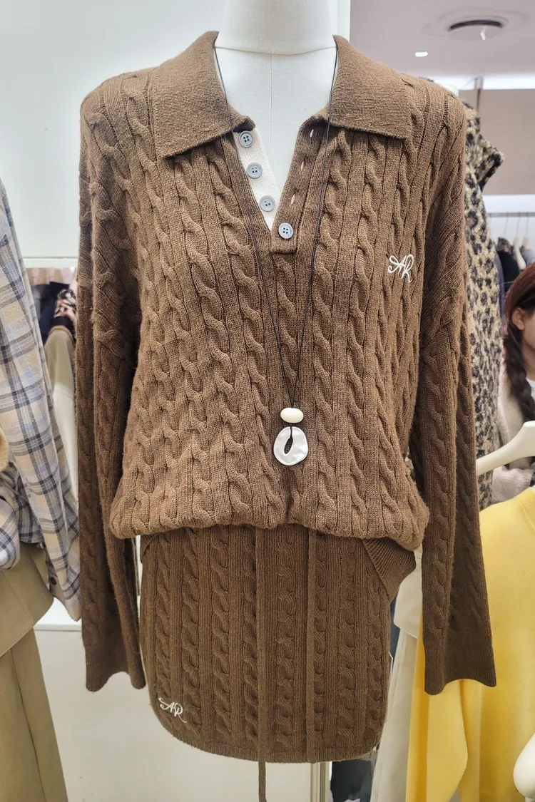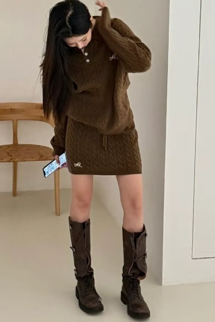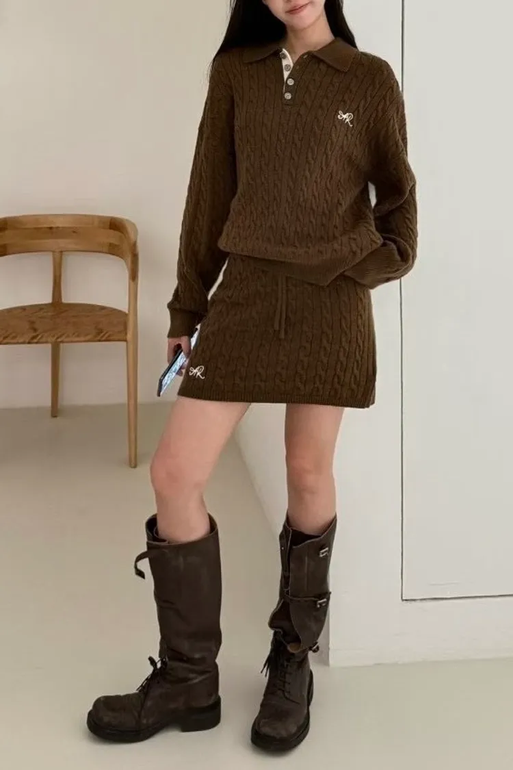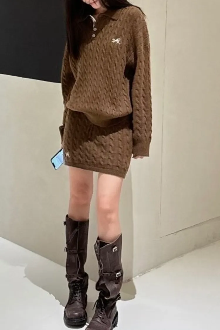 老錢風麻花POLO衫+褲裙針織套裝(一色)